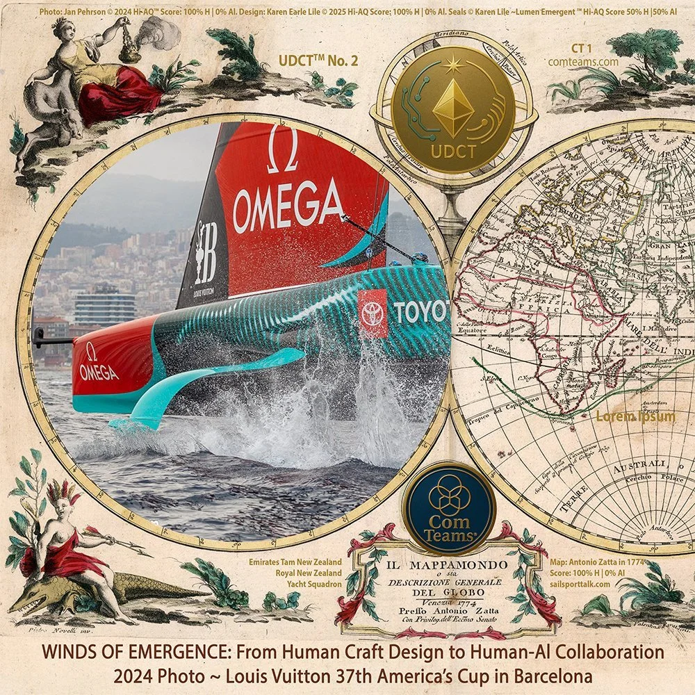 “Winds of Emergence” is the first UDCT™ (Unique Digital Commemorative Token) collection, commemorating human collaboration through the artistry of sailing, design, and ancient cartography. Each piece merges Jan Pehrson’s original America’s Cup photography with conceptual design by Karen Earle Lile, layered over an Antonio Zatta 1777 world map.